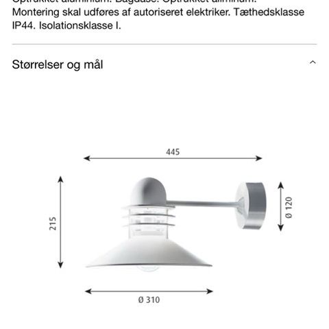 Væglampe, “Nyhavn, Nyhavn Væglampen 1 (et) stk i kobber fra Louis Poulsen er designet af Alfred Homann og Ole V. Kjær. Det er en flot og dekorativ udendørslampe, som med sin brede skærm sikrer en nedadrettet og komfortabel belysning. Indersiden af skærmen er mat hvidlakeret, hvilket medvirker til, at lampen giver et ensartet, blødt lys.