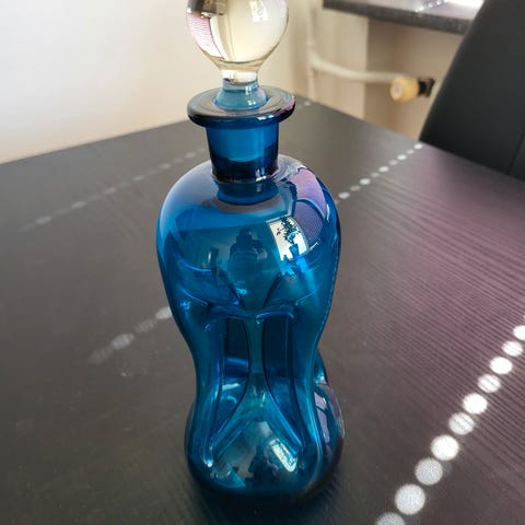 Klukflaske i klart glas med sort kongekrone prop fra Holmegård Glasværk år 1932. Måler 28 cm i højden incl. prop. Fejlfri. Vurderet til kr. 800, Sælges for kun