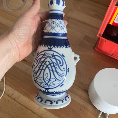 Flasken er formet så den ligger godt i hånden når der skal hældes og har sider i mørkeblå glasur.