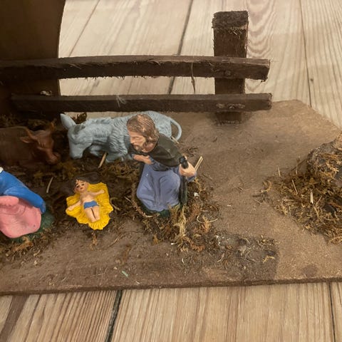 Krybben /figurerne har altid kun været i trækassen, som er fremstillet specielt til figurerne. Krybben er fremstillet i Polen.