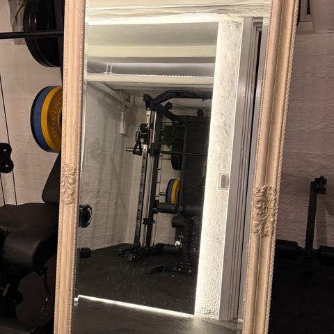 Spejl, Super fint spejl med lysestage. Måler 45 cm l højden og 19 cm i bredden. Har lidt brugsspor uden betydning.