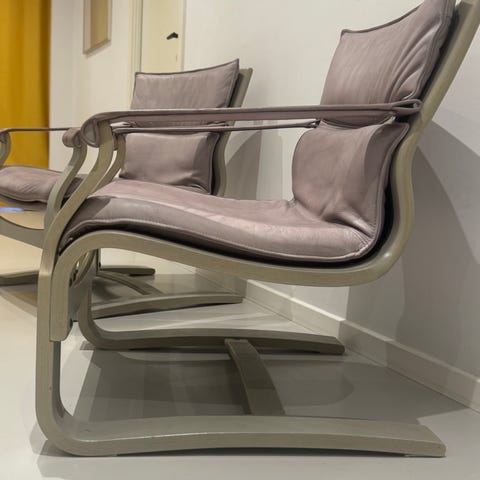Lænestol er designet af Åke Fribytter, og er lavet af sort læder og egetræ.