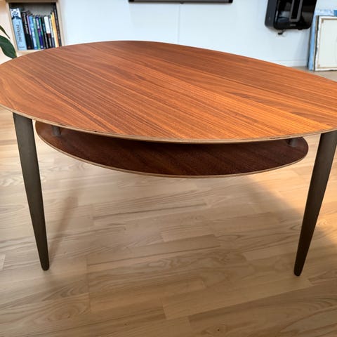 Bordpladen er lavet i valnød og stellet er mat sort strukturlakeret.