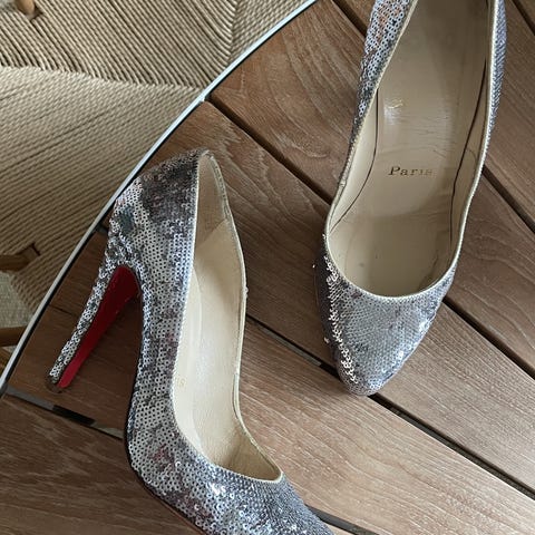 Stiletter, str. 37, Christian Louboutin, guld, sølv, glimmer, rød