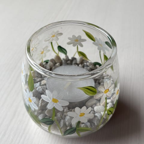 Lysestage, Sæby Glaspusteri, Fin lille håndlavet lysestage med flot indlejret spiral. 9cm høj og beregnet til fyrfadslys, kuglelys eller et lille bloklys.