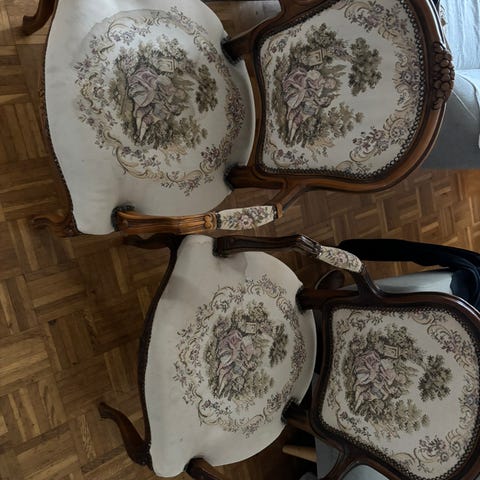 Stole, 0 år gl., 2 smukke dekorative stole m rosen mønster 300kr stk . Tricia Guild stof sat på af møbelpolster i 1995