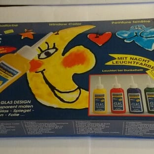 Andet, Farvepulver til glasmaling, 200g af hver af farverne: grøn, blå, rød, lilla, gul og orange. Jeg kan godt dele dem op i 100 grams poser, så det bliver 1/2 pris. (5 af dem ligger i nogle fine blå, kantede plastæsker med lysere blå låg, som stammer fra 1970'erne)