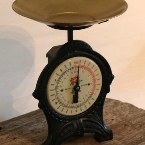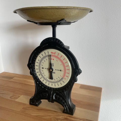 Gammel køkkenvægt, Emaljeskiive, Gammel køkkenvægt i jern og med emaljeskive. Skålen er også emalje. Måler 30 cm i højden.