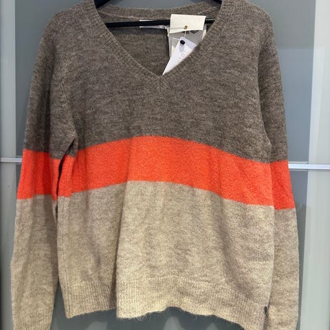 Rød med V fra coster Copenhagen størrelse S. 34% mohair, 34% wool, 27% polyester og 5% elestane.