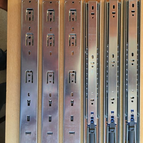 Skuffeskinne, 50 kg. Længde 500 mm, kan udtrækkes 550 mm. Har mange. Har været monteret men ikke brugt. Højde 60 mm Pr sæt