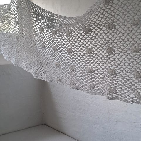 Gardin, b: 185 h: 33, 2 stk smukke hjemmehæklede "cafe`gardiner"