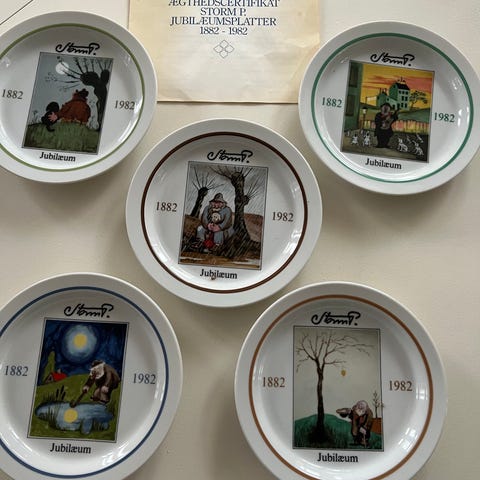 Storm P platter, 6 Storm P jubilæum platter. Diameter 18,5 cm. De er alle rigtige flotte. Pris pr stk 200 kr. Se også mine andre annoncer. Hv123