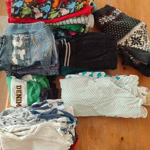 4 par bukser, 4 par shorts.3 striktrøjer, 1 cardigan, 9 langærmet t-shirt, 1 langærmet skjorte,