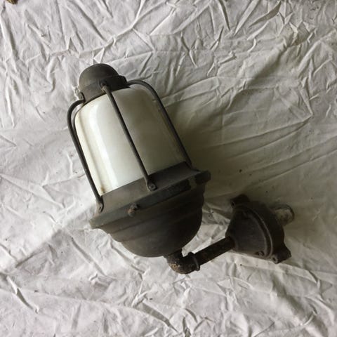 Udendørs væglamper i vintage antiklook til el-pærer. Jeg ved ikke om de fungerer - de skal helt klart tjekkes. Kraftige, store og flotte med intakt glas. Men der skal nok males. Ikke smedejern, ligner, men er lettere.