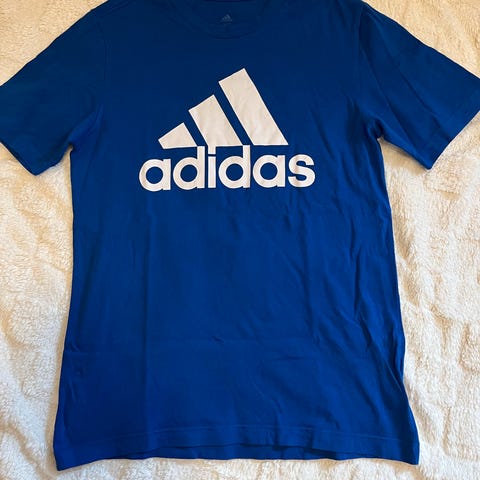 T-shirt, Blå, Adidas, str. 164, Med sort og hvidt tryk. I god stand. Uden huler og pletter. Kun vasket i allergivenligt vaskemiddel.