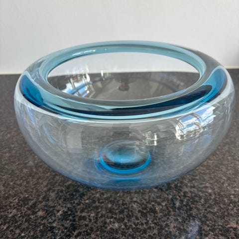 Stor Provence-skål, Royal Copenhagen/Holmegaard, Smuk stor Provence krystalskål i den fineste blå farve. Yderst velholdt. Designet af Per Lütken. Højde 16 cm. Hullets diameter foroven er 17 cm. Hele skålens diameter er 27 cm.