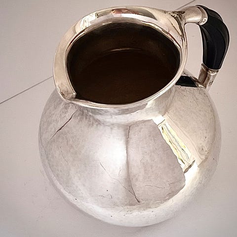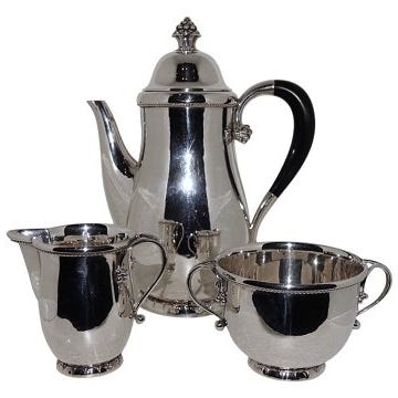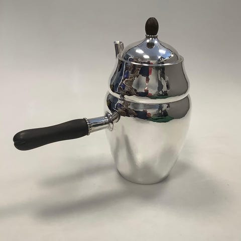 Georg Jensen Sterling Sølv Chocolade Kande No 32. Måler 21cm høj og er i god stand. Er fremstillet mellem 1915-1927. Denne med inskription E-AJ 12 juli 1932. Lille bule i tuden. Set til salg hos Dam Antik til 38.000,-kr.