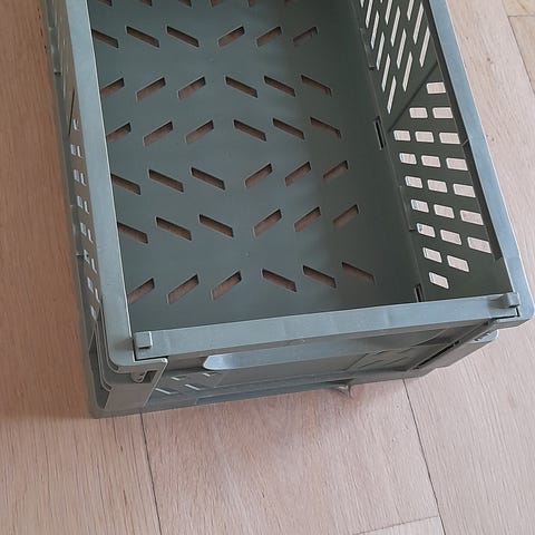 Kasserne kan pakkes ind i hinanden, så de kun fylder hvad der er vist på sidste foto.