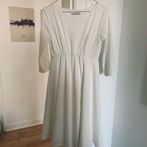 Brudekjole, Tiffany Rose , str. 36, Strækbar blonde , Næsten som ny, Smuk vente/graviditets brudekjole af strækbart blonde, så der er god plads til den voksende mave. 3/4 ærmer som gør kjolen perfekt til alle årstider og samtidig giver et elegant look. Kjolen har rund hals. Mærket hedder ‘Tiffany Rose’ og kjole-modellen: ‘Amelia’. Satinbånd til taljen følger med. Sælges, da jeg ikke får brug for den igen og synes det er synd at have en fin kjole liggende, som en anden måske kan få glæde af. Stadig pakket ind i plastisk, kun brugt en enkelt gang (sjovt nok) ;)