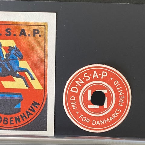 2. For Danmarks Ære, Frihed og ret fra DNSAP. Frimærket er desværre lidt i stykker i toppen.