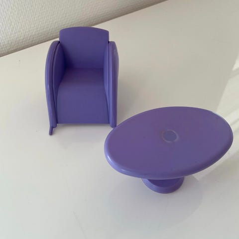 Lyserød legekube man kan kravle ind i, børnebord, barnestol, lille lilla kommode: 25 kr pr stk