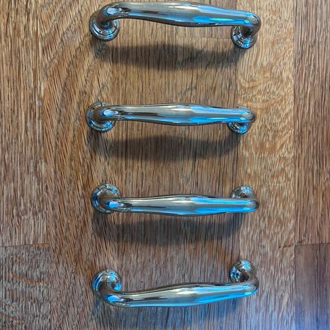 4 stk. Buet bøjlegreb i blank stål til brug indendørs på møbler fx på skuffer, skabe eller køkkenlåger. Originale skruer med til alle greb. Mål: 160 x 20 mm. Hulafstand: 128 mm. 2 stk. Pris - 30 kr.