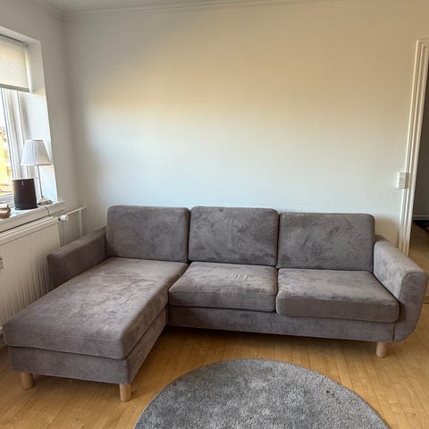 Den er omkring 2 år gammel og Den har et lille brandmærke på den ene chaiselong men intet tydeligt overordnet. Sælger da den ikke fungerer for os i stuen. Den får en grundig vask før afhentning.