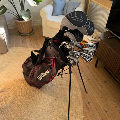 Andet, venstrehånds, grafit, Challenge, Ældre begyndergolfsæt (ukomplet, uden putter) til venstrehåndet kvinde bestående af jern nr 5, 7 og 9 plus fairwaykølle nr 5. Alle af samme mærke med stålhoveder og grafitskafter, L Flex. Ældre bærebag kan følge med. Samlet sæt 500 kr. Afhentes i Lyngby, sendes ikke.