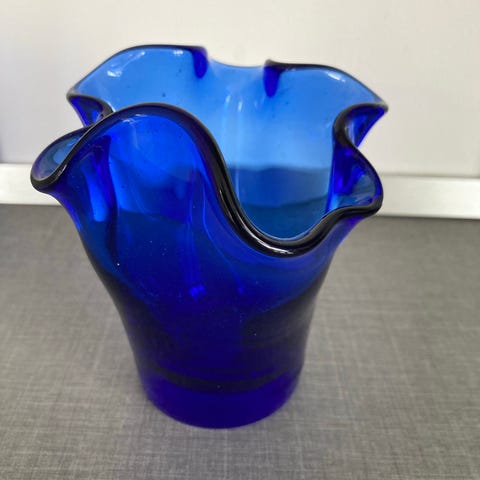 Flot, blå glasvase i mundblæst glas. Den måler ca. 17 cm i højden og Ø er 12 cm. Den er i meget fin stand med minimale brugsspor. Sender gerne.
