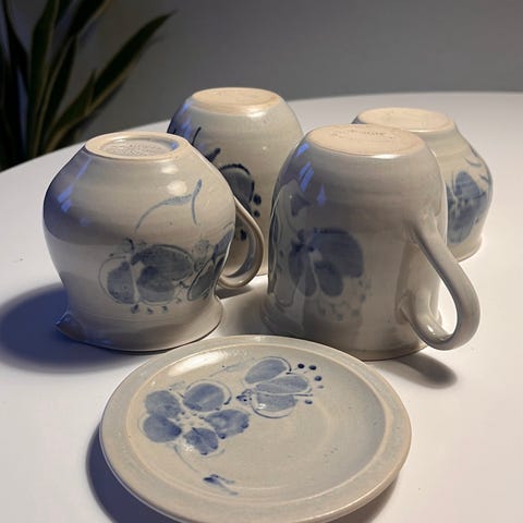 Et krus er blåt med blå blomst og det andet krus er hvidt med blå bomst.