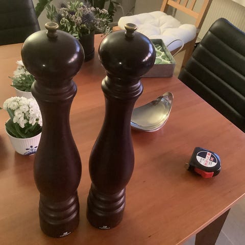 Peberkværne , Peugeot, To stilfulde Fiji-kværne i forskellige størrelser udført i et enkelt design med en moderne kontrast mellem træ og stål.
