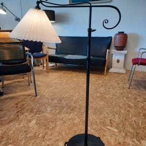 Gulvlampe, Gammel og unik gulvlampe i støbejern og med fræk ræd skærm. Højden er justerbar op til ca 170 cm.