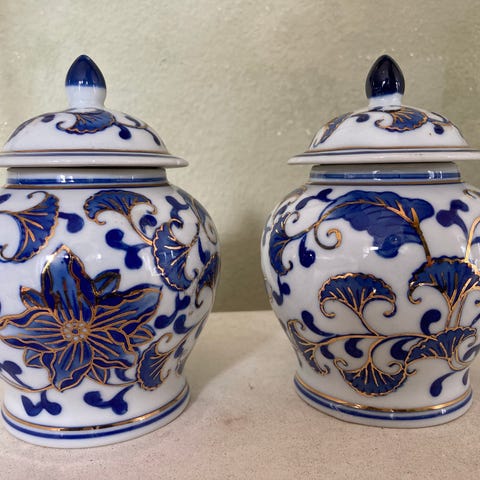 Porcelæn, Krukke/vase, Krukke i smukke farver og med bladguld. Kan også bruges som vase. H16 cm u/låg og H23 cm m/låg. Aldrig brugt. Kun stået til pynt.