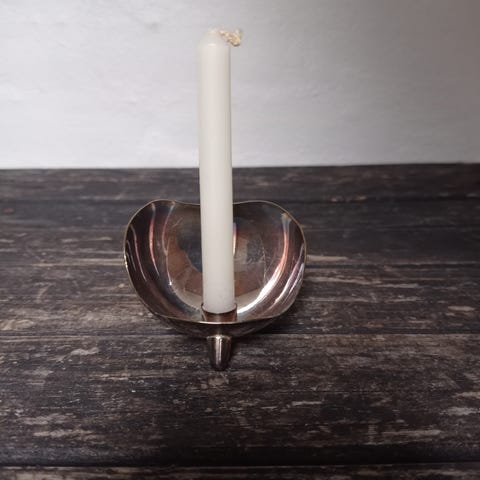 Lysestagerne er formentlig i sølvplet / pletsølv, da de kan blive "sorte" som sølv og pudses.