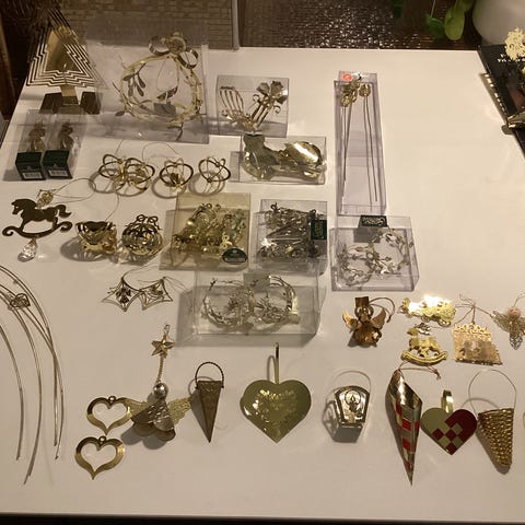RC julepynt, Royal Copenhagen, golden Christmas, Jette Frølich, Royal christmas o.a. Smuk bordpynt, kongelige ornamenter, delikat vintage julepynt mm i guldnuance (kobbermetal).