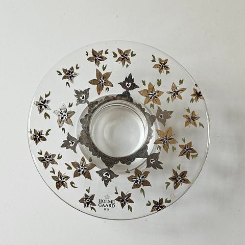 Kalenderlysestage, Holmegaard 2000, oval, silketryk "Mistelten og bladranker" i guld og grønt, passer til lys på 5 cm i dia. B: 18,8 cm, D: 12 cm, H: 3,5 cm. med Holmegaard label, lyset er IKKE incl. HELT INTAKT. Sælges for 110 kr. Sender gerne.dog IKKE MED fiks færdig. Porto oveni. N.B har også et julekage glas i samme årgang(2000) og mønster, findes i mine andre annoncer.