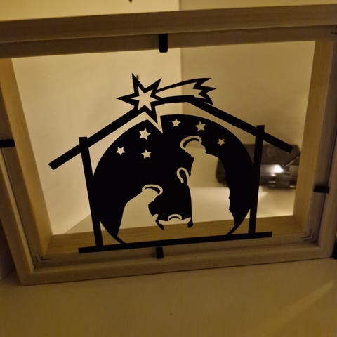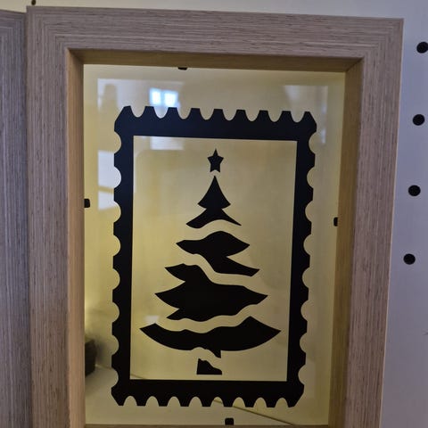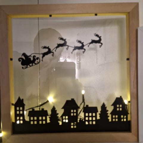 Æsken indeholder en ramme med 4 elektriske lys. Rammen måler 25 x 25 cm og kan både stå og hænge. Kæde medfølger.