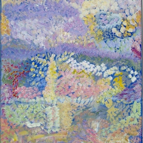 Oliemaleri, motiv: Fantasy, b: 54 cm h: 64 cm, Maleri/collage købt i Fåborg.