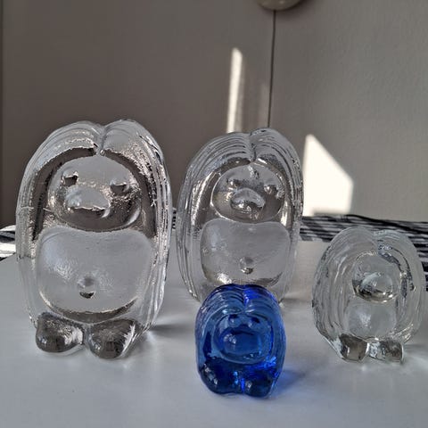 De er i meget god stand, ingen skår eller andet. Troldene af klar glas, fra den del af Sverige, der er kendt som Glasriket.