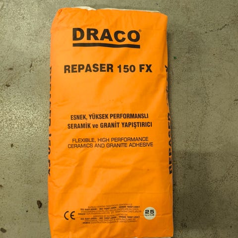 DRACO-Multi Fliseklæb-Grå, 25 kg, DRACO REPASER 150 FX er en højtydende, polymerforstærket fleksibel mørtel til at binde keramik, marmor og granit på beton, afretningslag og puds.