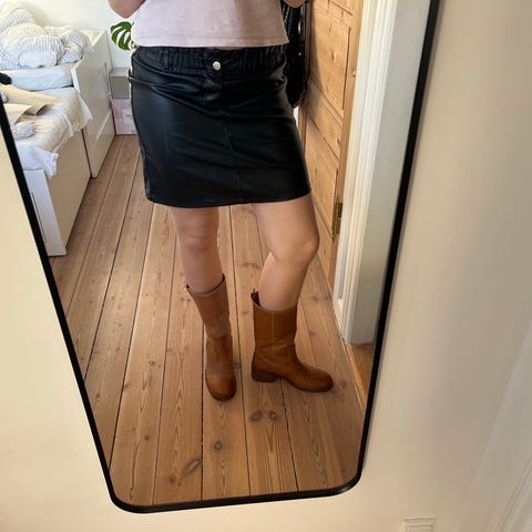 Lammelæder, str. 34, H&M, Vinrød , Læder , Næsten som ny, Knælang figursyet pencilnederdel i blødt læder med diskrete sidelommer samt skjult lynlås og trykknap bagpå i taljen. Lige skåret kant forneden med slids foran.