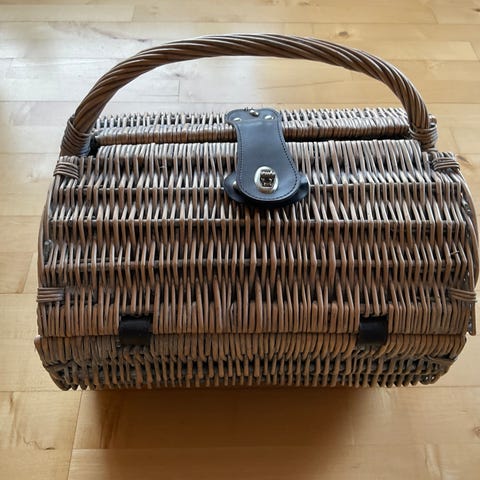 Retro picnickurv med service til 4 personer. Har alderssvarende brugsspor, men er ellers i flot stand.