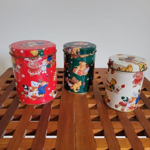 Kagedåser, En helt fin samling af kagedåser med forskelige motiver, størrelser, patina og pris. Der er retro, jule- og gammel dåser. De bærer præg af aldre og brug.