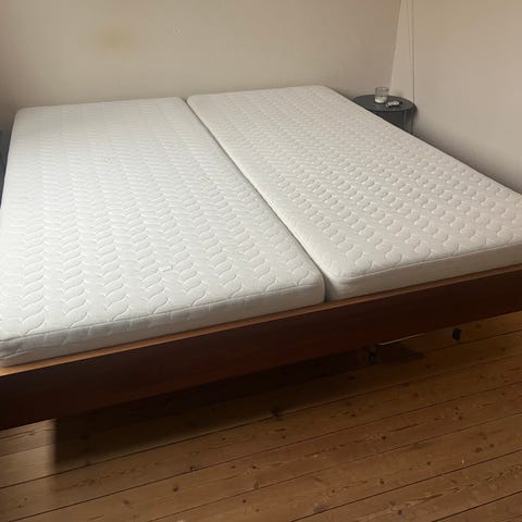 Dobbeltseng , Dunlopillo, b: 180 l: 200 h: 30, kan også laves til to enkeltsenge. Der følger en god og kun lidt brugt latexmadras med. Liggehårdhed på senge kan indstilles. Sælges med ben.