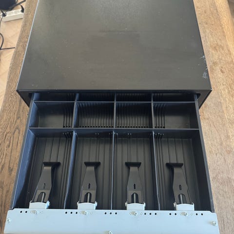 Kasseapparat Skuffe, Det er kun skuffen og det på billedet der er til salg Helt nyt med alt tilbehør undtagen nøgler. Der er en anden måde til at få det op som sidder under bunden hvis ikke man selv vil skifte låsen. Dette er et kvalitetsprodukt. Producent og model kendes ikke.