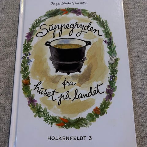 Suppegryden fra huset på landet, Inga Linde Jensen , emne: mad og vin, Suppeopskrifter fra Inga Linde Jensen, trykt med hendes karakteristiske håndskrift og fine akvareltegninger