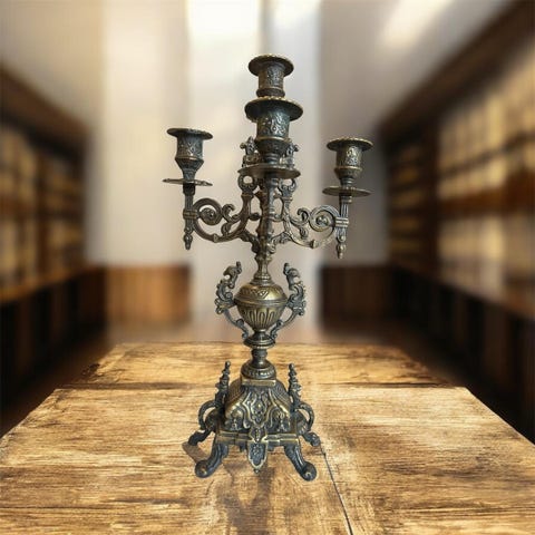Kandelabre, Mesing, Et par gamle franske kandelabere med prismer, - stammer fra et kloster nær Montpezat de Quercy i Tarn et Garonne departementet.