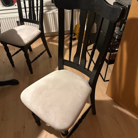 Spisebordsstol, Træ, 4 stk spisebordsstole i fint træ med stofindtræk sælges. Byd byd byd!