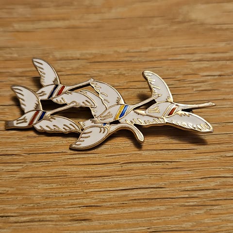 Broche, sølv, Erik Magnussen, De fem nordiske svaner. Sølv med emalje. Tegnet og udvirket af Erik Magnussen ( 1884-1960)