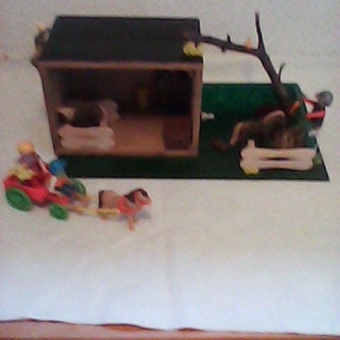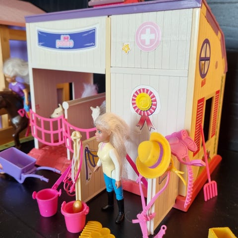 Stald, Sød pony stald med 2 heste og 2 ryttere i plastik. Medfølger også en hestetransport bil.